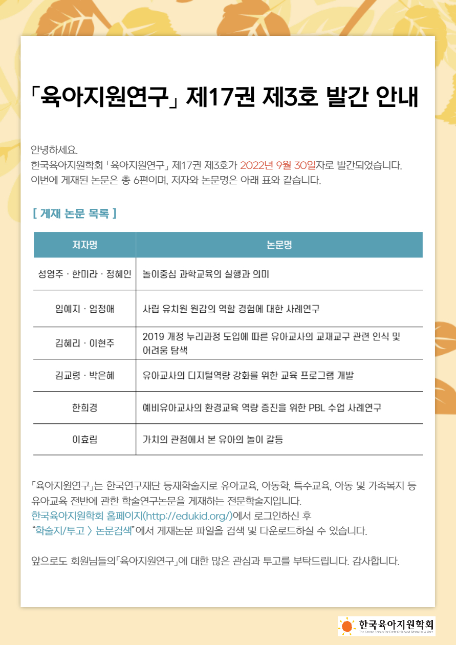 2022 육아지원연구 제 17권 제3호 발간 안내