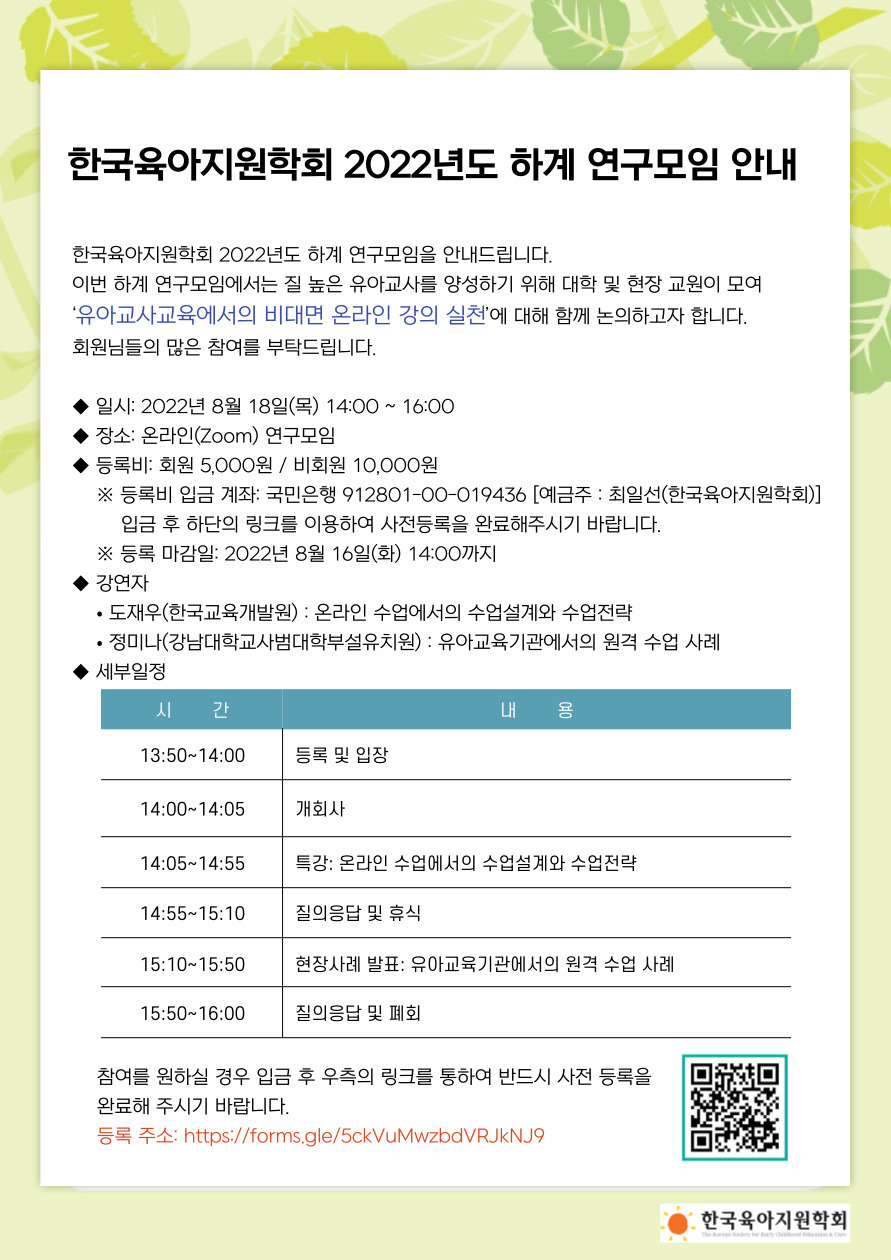 한국육아지원학회 2022년도 하계 연구모임을 안내드립니다.