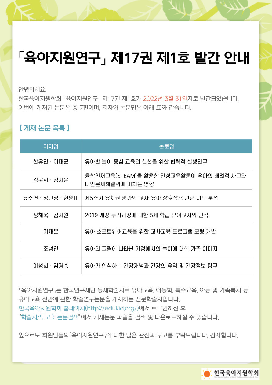 2022 육아지원연구 제 17권 제1호 발간 안내