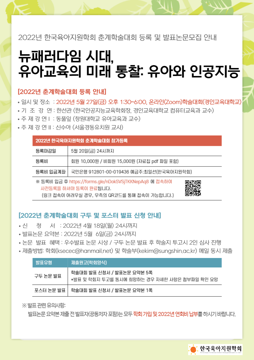 춘계학술대회는 “뉴패러다임 시대, 유아교육의 미래 통찰: 유아와 인공지능”이라는 대주제로 5월 27일(금)에 온라인(ZOOM)학술대회(경인교육대학교)로 개최됩니다. 인공지능교육이 세계적으로 국가 수준 교육과정에 포함되는 가운데, 유아와 인공지능에 대해 깊이 통찰해보고 함께 의견을 나누며 소통하는 귀한 시간을 갖도록 하겠습니다.