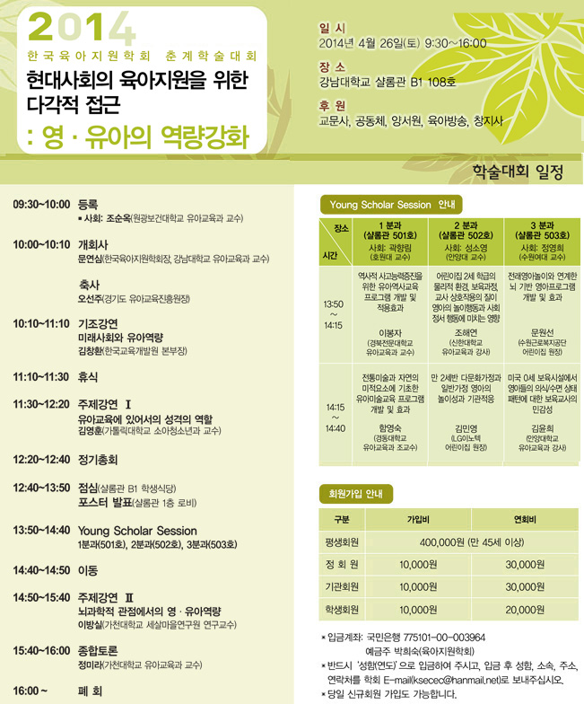 2014년 한국육아지원학회 춘계학술대회를 다음와 같이 개최하오니 많은 관심과 적극적인 성원을 부탁드립니다.