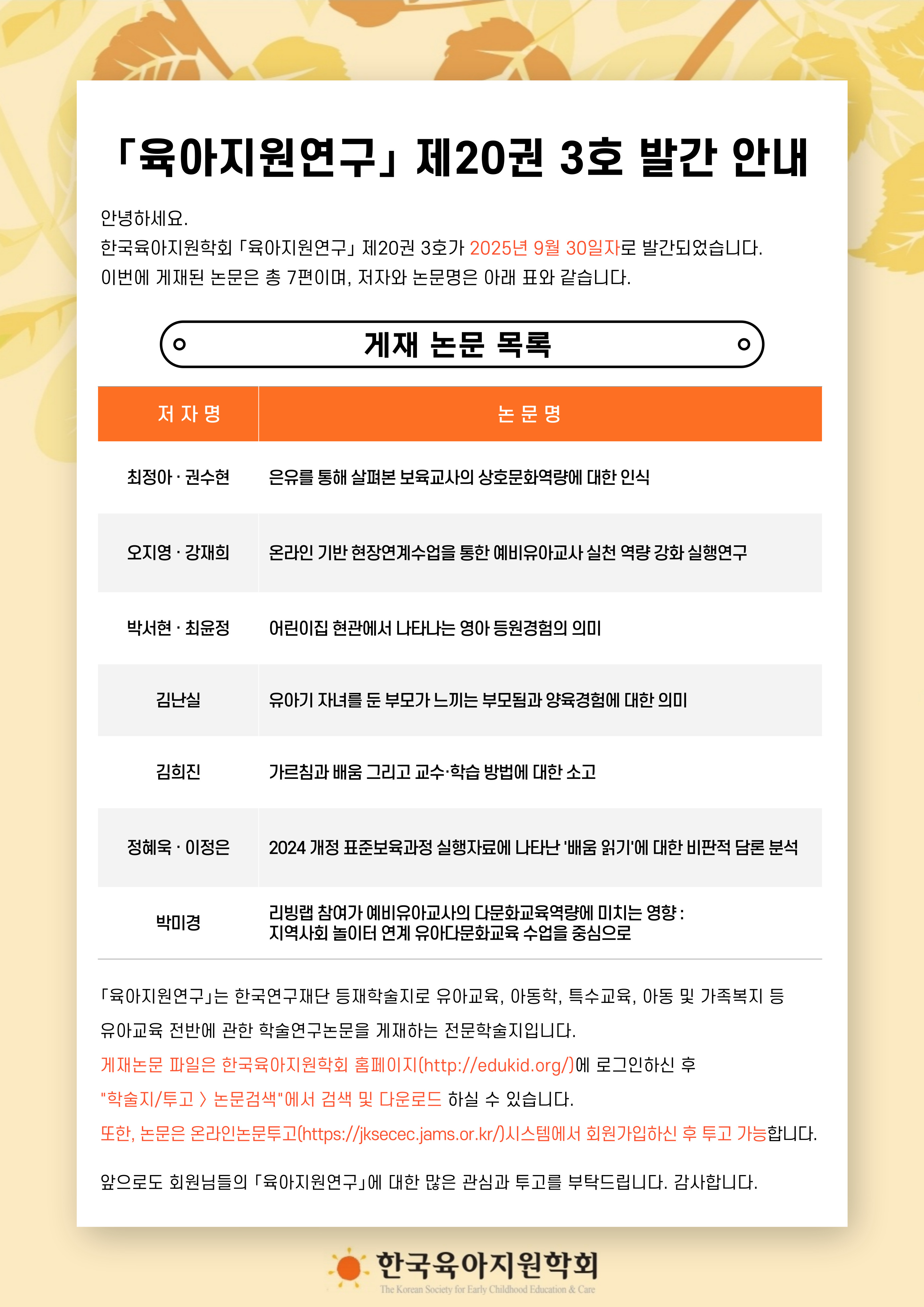 한국육아지원학회 「육아지원연구」 제20권 3호가 2025년 9월 30일자로 발간(게재논문 7편)되었습니다.